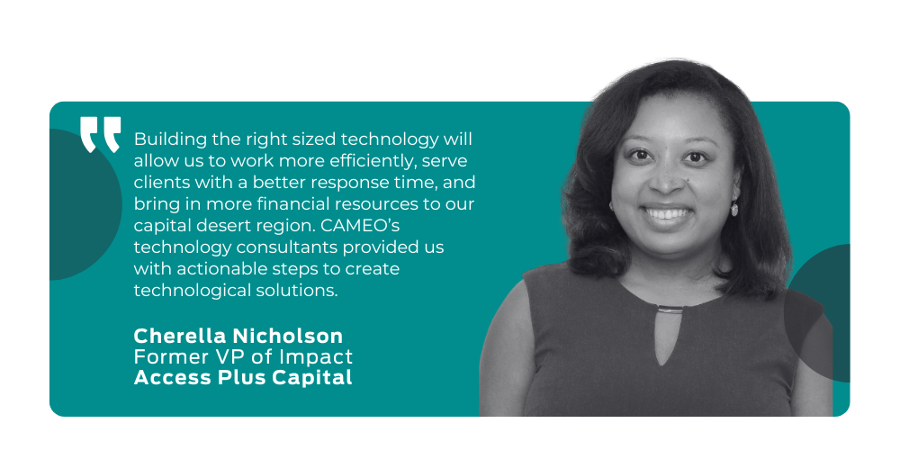 CAMEO Network launched the CDFI Shared Services Center in September 2022 with a $2 million grant from Citi Foundation’s Community Finance Innovation Fund. The SSC is the first-of-its-kind resource designed to help CDFIs increase internal capacity so they can serve more entrepreneurs and communities.